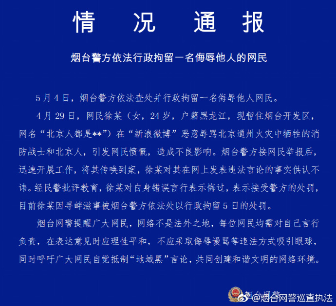 山東省煙臺市公安局網(wǎng)絡(luò)安全保衛(wèi)支隊官方微博今日發(fā)布情況通報。通報稱,一女子在微博惡意辱罵北京通州火災(zāi)中犧牲的消防戰(zhàn)士和北京人,造成不良影響,因?qū)め呑淌卤粺熍_警方依法處以行政拘留5日的處罰。