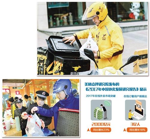 快節(jié)奏的都市生活、迅捷的網(wǎng)絡(luò)支付和日益發(fā)達(dá)的配送網(wǎng)絡(luò),催生了以“美團(tuán)外賣”“百度外賣”“餓了么”等為代表的網(wǎng)絡(luò)餐飲服務(wù)平臺(tái)。美團(tuán)點(diǎn)評(píng)研究院發(fā)布的《2017年中國(guó)外賣發(fā)展研究報(bào)告》顯示,2017年在線外賣市場(chǎng)突破2000億元,同比增長(zhǎng)23%;在線訂餐用戶規(guī)模達(dá)3億人,同比增長(zhǎng)18%。