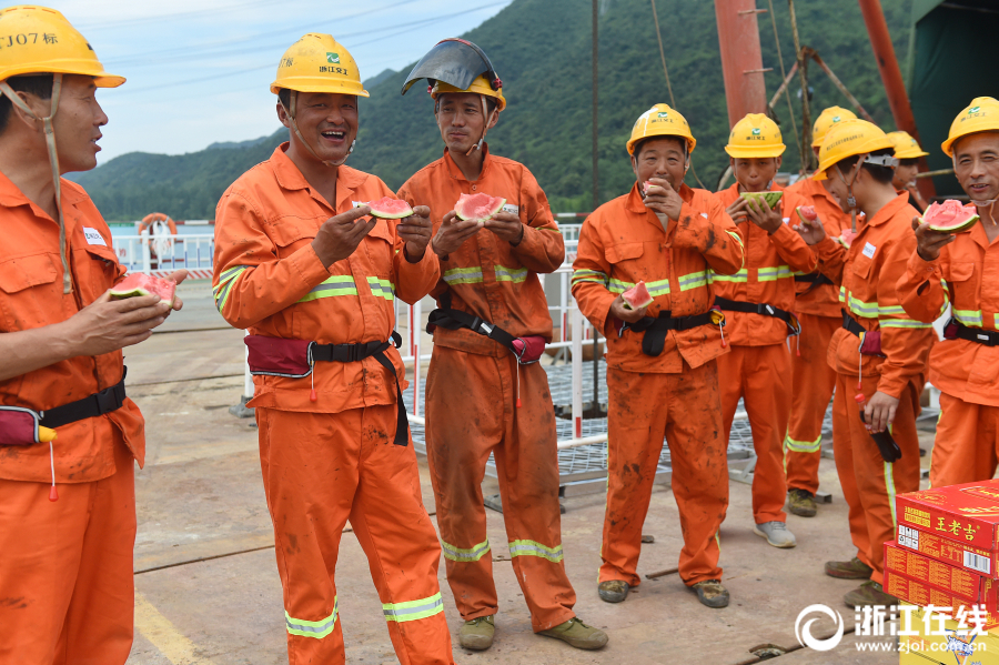 5月16日,杭州持續(xù)高溫,最高氣溫達(dá)37.5℃。在G25長(zhǎng)深高速德清至富陽(yáng)段擴(kuò)容工地,工人正在抓緊建設(shè)跨富春江大橋。承建施工項(xiàng)目的浙江交工宏途交通建設(shè)有限公司,為一線(xiàn)建設(shè)者送來(lái)了清涼用品和防暑藥品,慰問(wèn)高溫下作業(yè)的施工人員。(浙江在線(xiàn)記者 吳元峰 攝)