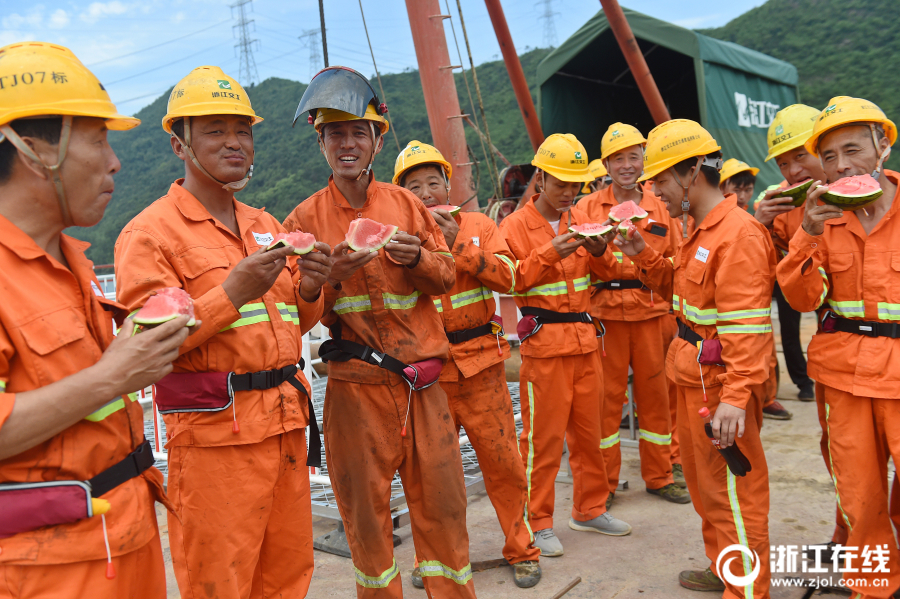 5月16日,杭州持續(xù)高溫,最高氣溫達37.5℃。在G25長深高速德清至富陽段擴容工地,工人正在抓緊建設跨富春江大橋。承建施工項目的浙江交工宏途交通建設有限公司,為一線建設者送來了清涼用品和防暑藥品,慰問高溫下作業(yè)的施工人員。(浙江在線記者 吳元峰 攝)