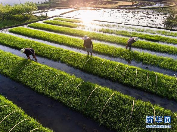 5月21日,在貴州省大方縣對(duì)江鎮(zhèn)金星村,村民在秧田里進(jìn)行苗床管理。新華社發(fā)(羅大富 攝)