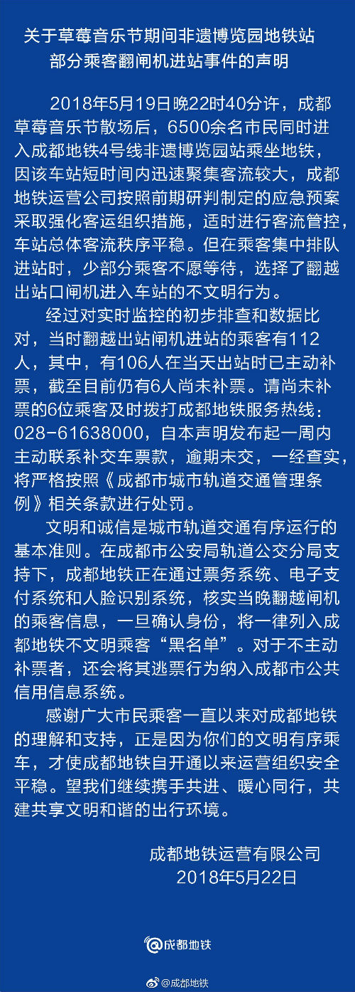 5月22日,成都地鐵發(fā)布“關(guān)于草莓音樂(lè)節(jié)期間非遺博覽園地鐵站部分乘客翻閘機(jī)進(jìn)站事件的聲明”(以下簡(jiǎn)稱“聲明”),稱,5月19日晚草莓音樂(lè)節(jié)散場(chǎng)后翻越地鐵4號(hào)線非遺博覽園站出站閘機(jī)進(jìn)站的乘客112人中,尚有6人尚未補(bǔ)票。“聲明”發(fā)布起一周內(nèi),希望他們主動(dòng)聯(lián)系補(bǔ)交車票款,逾期未交,一經(jīng)查實(shí),將嚴(yán)格按照《成都市城市軌道交通管理?xiàng)l例》相關(guān)條款進(jìn)行處罰。