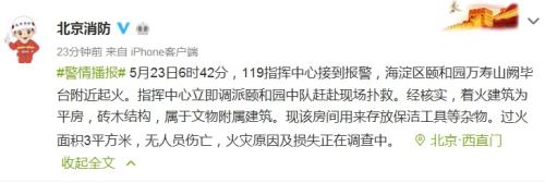 據(jù)北京市公安局消防局官方微博消息,5月23日6時42分,119指揮中心接到報警,海淀區(qū)頤和園萬壽山闕畢臺附近起火。指揮中心立即調(diào)派頤和園中隊趕赴現(xiàn)場撲救。