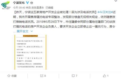 據(jù)寧波市政府新聞辦公室官方微博消息,5家房地產(chǎn)開發(fā)企業(yè)向?qū)幉ㄊ屑本戎行?20電話撥打推銷電話,寧波市住建委會同部分屬地住建部門,要求開發(fā)企業(yè)立即停止這一騷擾行為,責(zé)令其限期整改,并處以暫停網(wǎng)簽、延緩發(fā)放預(yù)售許可證等相關(guān)處罰措施。