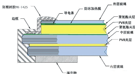 A320系列的風(fēng)擋由多層不同的材料組成,最外層的是熱鋼化玻璃,位于中層和內(nèi)層的是化學(xué)強化玻璃,各層玻璃之間通過聚胺酯層和PVB層粘接在一起。