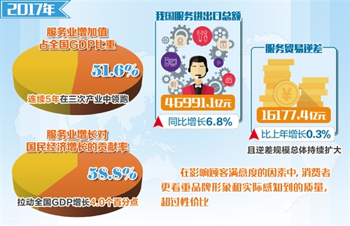 服務(wù)業(yè)是現(xiàn)代化經(jīng)濟(jì)體系建設(shè)的關(guān)鍵領(lǐng)域。統(tǒng)計(jì)數(shù)據(jù)顯示,2017年,服務(wù)業(yè)增加值占全國GDP比重為51.6%,連續(xù)5年在三次產(chǎn)業(yè)中領(lǐng)跑,服務(wù)業(yè)增長對國民經(jīng)濟(jì)增長的貢獻(xiàn)率為58.8%,拉動(dòng)全國GDP增長4.0個(gè)百分點(diǎn)。