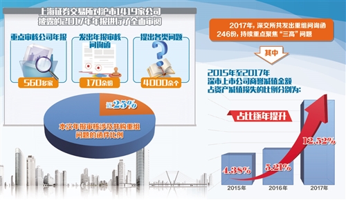 隨著上市公司年報(bào)披露季結(jié)束,證券交易所對(duì)公司的年報(bào)審核也隨之進(jìn)入高峰。目前,審核工作基本完成。上海證券交易所全面審閱了滬市1419家公司披露的2017年年報(bào),重點(diǎn)審核了560多家公司年報(bào),發(fā)出年報(bào)審核問詢函170余份,提出各類問題4000余個(gè),全部審核問詢函均對(duì)外公開。值得關(guān)注的是,“三高”(高估值、高商譽(yù)、高業(yè)績(jī))并購(gòu)后遺癥十分明顯。