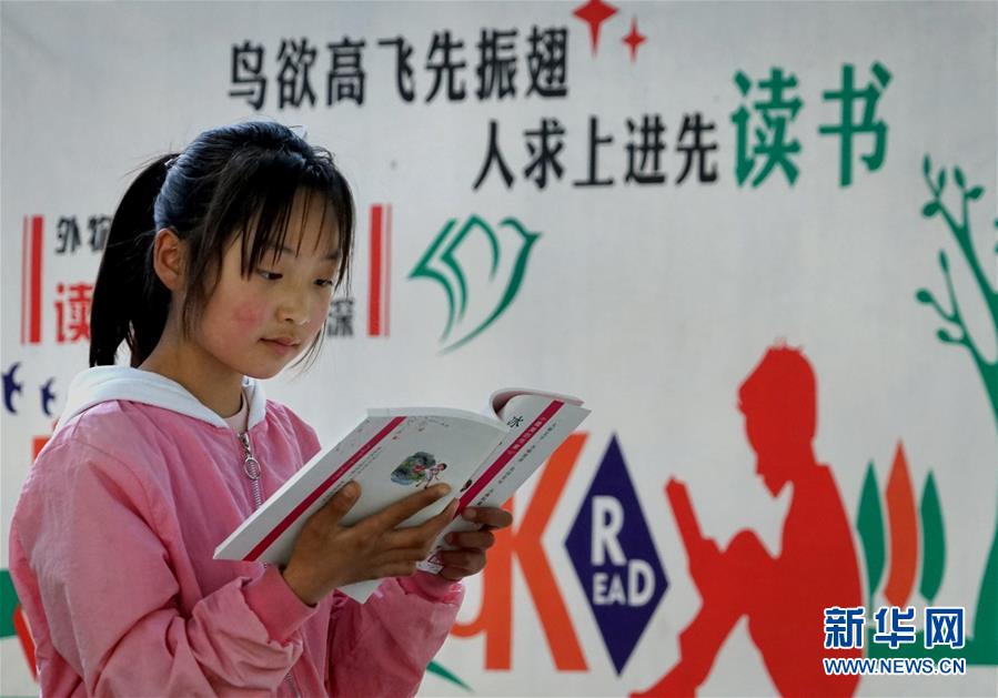 河南焦作市博愛縣寨豁鄉(xiāng)小學學生郭艷冰在校內閱讀從“焦作市圖書館館外流通點”借閱的書籍(4月18日攝)。新華社記者 李安 攝