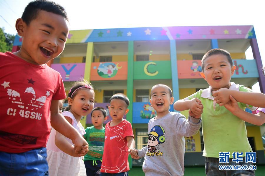 陜西省安康市漢濱區(qū)雙龍鎮(zhèn)杜壩村五四小學附設幼兒園小朋友們在操場上做游戲(2017年6月16日攝)。這個幼兒園使用貸款資金翻修改造而成,有效解決了該村及周邊兒童學前教育缺失的問題。新華社記者 邵瑞 攝