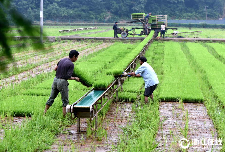 6月4日,武義縣一育秧工廠員工忙著為訂單農(nóng)戶(hù)起運(yùn)單季稻秧苗。隨著“芒種”節(jié)氣的到來(lái),武義縣農(nóng)民搶抓有利時(shí)機(jī),加快翻耕平整水田,搶種單季水稻。(浙江在線(xiàn)拍友 張建成 攝)