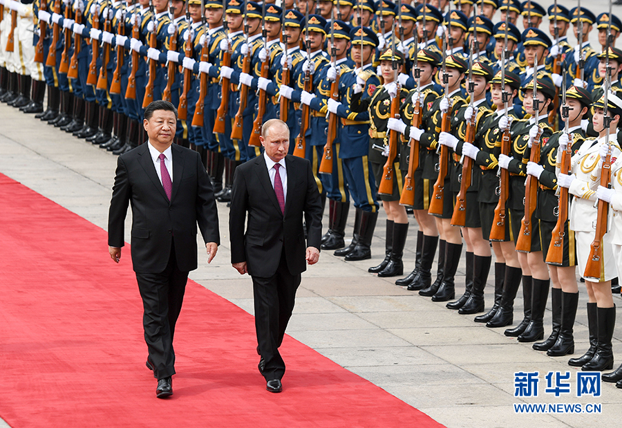 6月8日,國家主席習近平在北京人民大會堂同俄羅斯總統(tǒng)普京舉行會談。這是會談前,習近平在人民大會堂東門外廣場為普京舉行歡迎儀式。新華社記者 陳曄華 攝