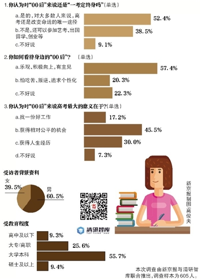 一年一度的高考剛剛落下帷幕。據(jù)教育部統(tǒng)計(jì),今年全國(guó)共有975萬名考生參加高考,人數(shù)創(chuàng)下最近8年來的新高,比去年增加了35萬人。值得注意的是,今年參加高考的學(xué)生,大多也是在2000年出生的“千禧寶寶”。雖然說起來,其實(shí)所謂的“00后”,跟“80后”、“90后”,以及任何一種“后”,本質(zhì)上都沒有什么區(qū)別。在高考面前,在人生的關(guān)口面前,他們都是命運(yùn)的“考生”。但是,時(shí)代不同,一代人也自有一代人不同的際遇。對(duì)此,我們需要關(guān)注什么?本期“京報(bào)調(diào)查”(新京報(bào)與清研智庫(kù)聯(lián)合推出)就此展開調(diào)查。