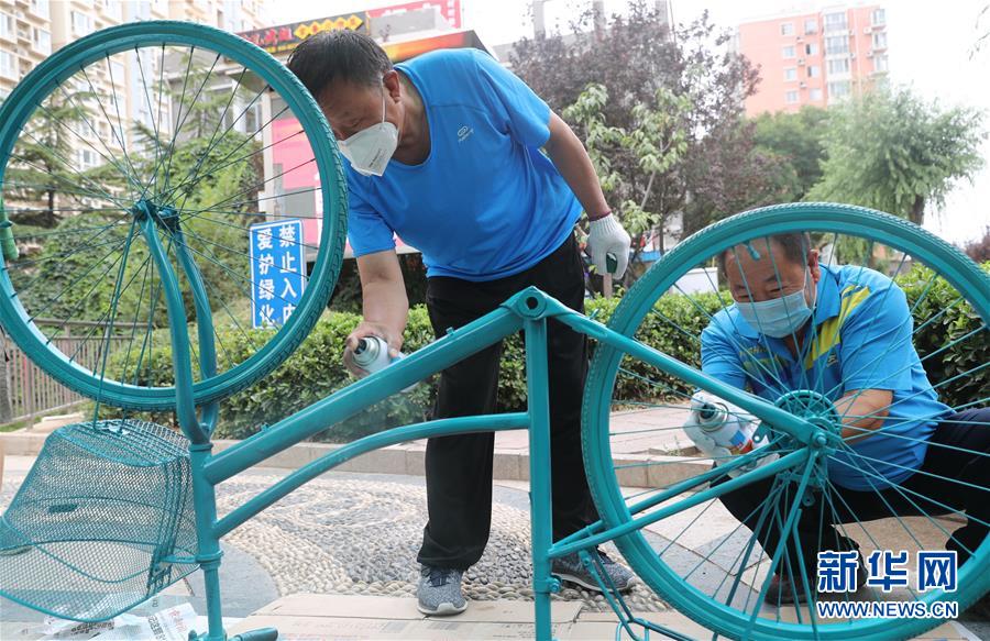 6月9日,豐臺區(qū)花鄉(xiāng)天倫錦城社區(qū)居民們在給廢舊自行車噴漆。