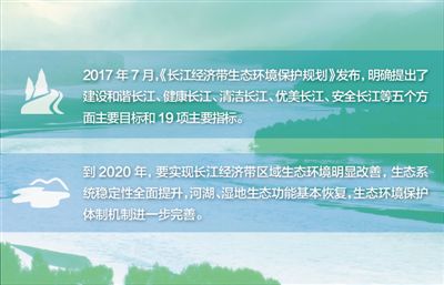 長江大保護(hù),規(guī)劃先行。2016年,《長江經(jīng)濟(jì)帶發(fā)展規(guī)劃綱要》印發(fā)。去年7月,《長江經(jīng)濟(jì)帶生態(tài)環(huán)境保護(hù)規(guī)劃》發(fā)布,提出了建設(shè)和諧長江、健康長江、清潔長江、優(yōu)美長江、安全長江等五個(gè)方面主要目標(biāo)和19項(xiàng)主要指標(biāo)——到2020年,要實(shí)現(xiàn)長江經(jīng)濟(jì)帶區(qū)域生態(tài)環(huán)境明顯改善,生態(tài)系統(tǒng)穩(wěn)定性全面提升,河湖、濕地生態(tài)功能基本恢復(fù),生態(tài)環(huán)境保護(hù)體制機(jī)制進(jìn)一步完善;地表水質(zhì)量國控?cái)嗝妫c(diǎn)位)達(dá)到或優(yōu)于Ⅲ類水質(zhì)比例達(dá)到75%以上,劣Ⅴ類比例小于2.5%,地級及以上城市集中式飲用水水源水質(zhì)達(dá)到或優(yōu)于Ⅲ類比例達(dá)到97%以上。