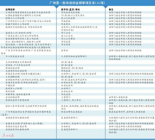 據(jù)悉,廣州自去年10月起已啟動(dòng)“減證便民”專項(xiàng)工作,由市編辦牽頭,會(huì)同市法制辦、市政務(wù)辦對(duì)市政府各部門(mén)的證明事項(xiàng)進(jìn)行梳理審核。經(jīng)研究,市政府第一批取消7個(gè)部門(mén)共33項(xiàng)證明事項(xiàng),其中市教育局13項(xiàng)、市人力資源社會(huì)保障局10項(xiàng)、市公安局4項(xiàng)、市司法局3項(xiàng)、市民政局1項(xiàng)、市交委1項(xiàng)、市食品藥品監(jiān)管局1項(xiàng)。