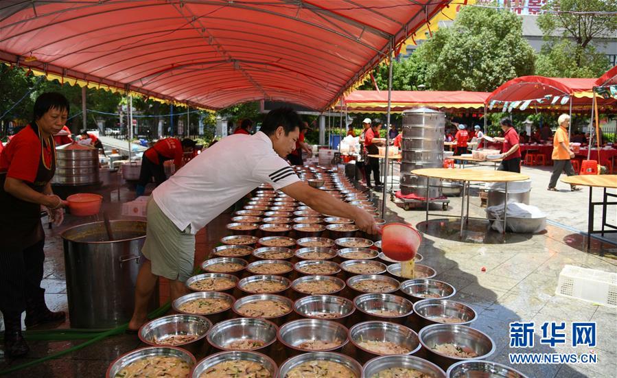 6月14日,工作人員在廣州天河區(qū)珠村七夕廣場準(zhǔn)備龍舟飯。當(dāng)日,廣州市天河區(qū)舉行一場熱鬧歡快的龍舟活動(dòng),來自多個(gè)村莊“走親戚”的龍舟隊(duì)參加。按廣州的傳統(tǒng)習(xí)俗,每年農(nóng)歷五月初一至初五,各村的龍舟隊(duì)要到周圍村落“走親戚”。走親戚的龍舟隊(duì)到來時(shí),受訪村子要準(zhǔn)備好龍舟飯招待來客?;顒?dòng)當(dāng)天,鳴炮敲鑼,一派喜慶氣氛。新華社記者 鄧華 攝