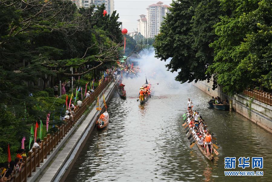 6月14日,多個村的龍舟隊(duì)在廣州市天河區(qū)一處河道劃龍舟。當(dāng)日,廣州市天河區(qū)舉行一場熱鬧歡快的龍舟活動,來自多個村莊“走親戚”的龍舟隊(duì)參加。按廣州的傳統(tǒng)習(xí)俗,每年農(nóng)歷五月初一至初五,各村的龍舟隊(duì)要到周圍村落“走親戚”。走親戚的龍舟隊(duì)到來時,受訪村子要準(zhǔn)備好龍舟飯招待來客?;顒赢?dāng)天,鳴炮敲鑼,一派喜慶氣氛。新華社記者 鄧華 攝
