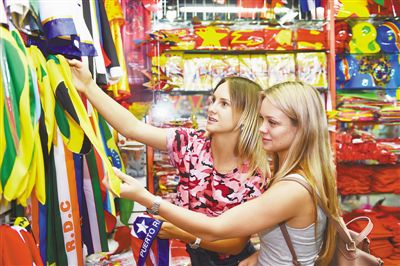 2018俄羅斯“世界杯”帶火浙江義烏體育用品。圖為6月13日,兩名俄羅斯客商在義烏國(guó)際商貿(mào)城采購(gòu)球迷用品。人民視覺(jué)