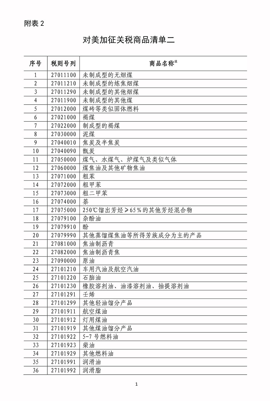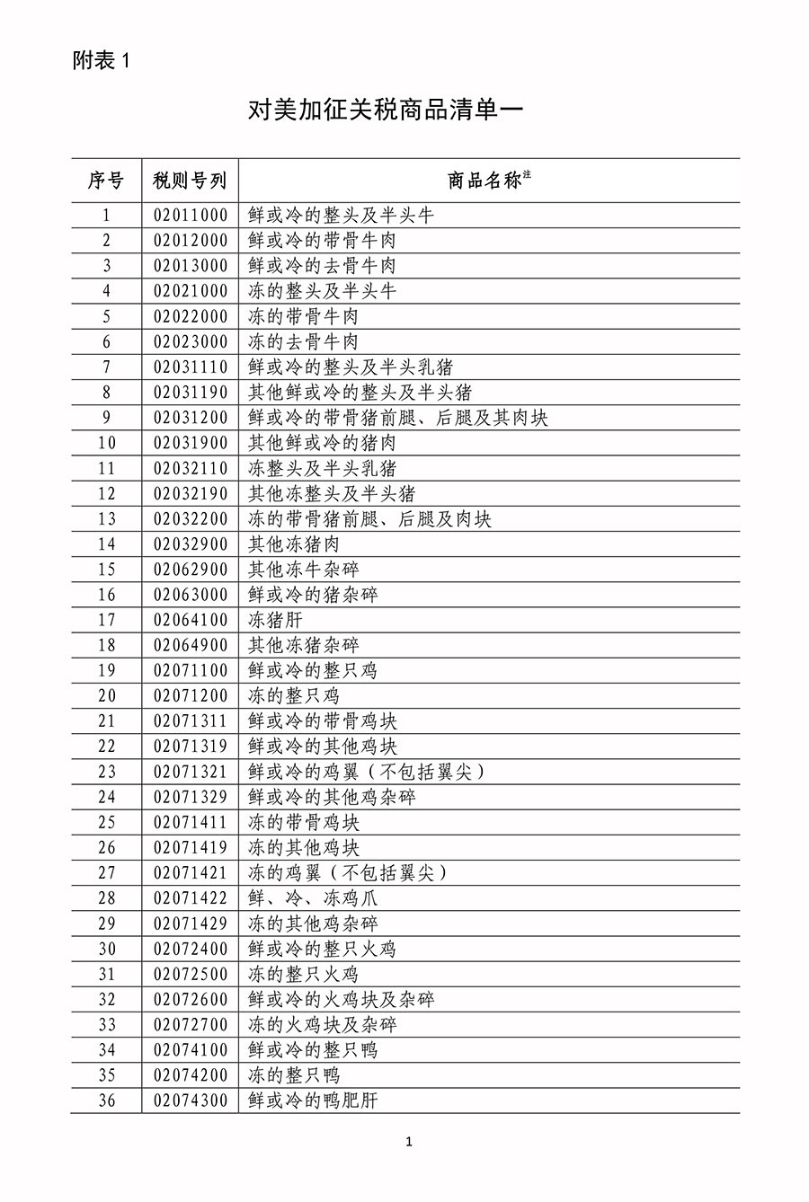 附表1 對(duì)美加征關(guān)稅商品清單一