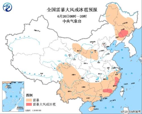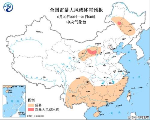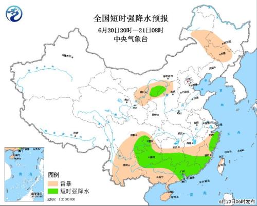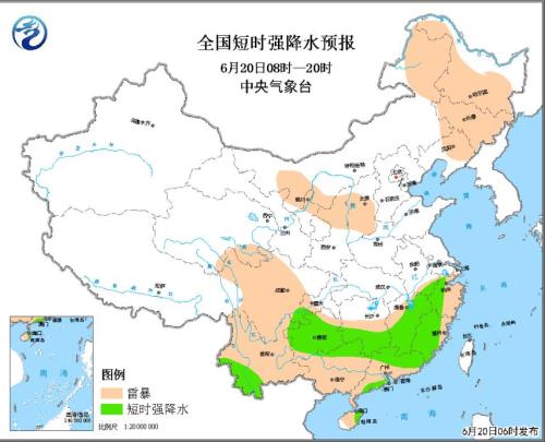 預(yù)計(jì)6月20日08時到21日08時,貴州、湖南中南部、江西、浙江、福建、廣東中北部、海南東北部、云南西南部等地的部分地區(qū)將有短時強(qiáng)降水天氣,小時雨強(qiáng)20-50毫米,局地可達(dá)60毫米以上;另外,內(nèi)蒙古中部和東部、吉林南部、遼寧東北部、浙江南部、福建北部和南部、廣東北部等地局地將有雷暴大風(fēng)或冰雹天氣。