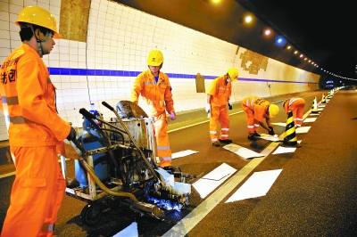 昨天上午,在懷柔區(qū)分水嶺隧道,路政養(yǎng)護(hù)人員正在安裝各類交通安全標(biāo)識(shí)。隨著防撞護(hù)欄、反光輪廓、視覺(jué)減速標(biāo)識(shí)陸續(xù)安裝完成,幽暗狹長(zhǎng)的隧道變得明亮起來(lái)。據(jù)介紹,反光輪廓和視覺(jué)減速標(biāo)識(shí)首次在京隧道投入使用,無(wú)論白天還是夜間,明亮的標(biāo)識(shí)都能引導(dǎo)司機(jī)看清路面。
