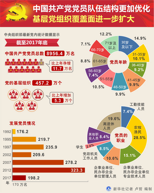 截至2017年12月31日,中國(guó)共產(chǎn)黨黨員總數(shù)為8956.4萬(wàn)名,比上年凈增11.7萬(wàn)名,增幅為0.1%。