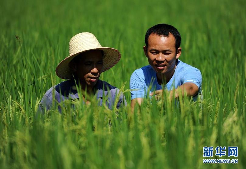 在江西永新縣三灣鄉(xiāng)三灣村田西村小組,時(shí)任村支部書記的邢鐳(右)和村民劉小林在交流紫稻生長狀況(2013年8月10日攝)。新華社記者周科 攝