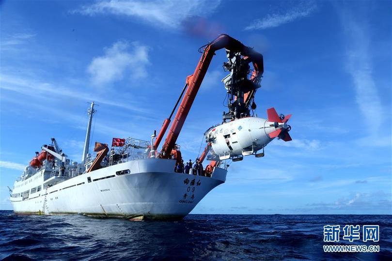 “蛟龍”號載人潛水器進(jìn)入水中,進(jìn)行中國大洋38航次最后一潛(2017年6月13日攝)。新華社記者 劉詩平 攝