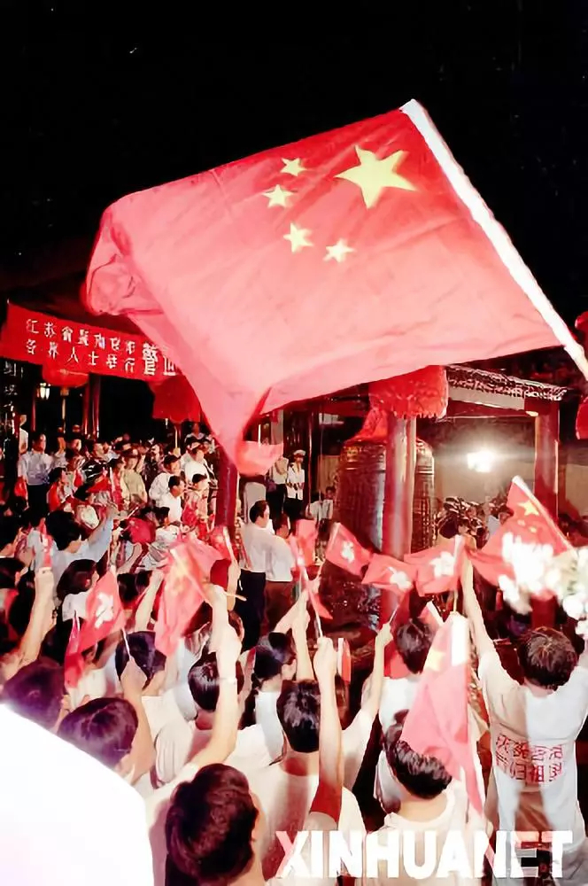 1997年6月30日晚,江蘇省南京市各界群眾代表在當(dāng)年《南京條約》議約地南京靜海寺舉行撞響“警世鐘”儀式。靜海寺大鐘一共敲響了155下,寓意香港離開祖國155年后又回到祖國的懷抱。新華社 發(fā)