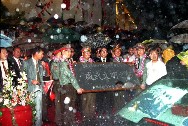 1997年7月1日清晨,中國人民解放軍駐香港部隊(duì)進(jìn)入香港,受到香港市民的熱烈歡迎。新界區(qū)各界代表向駐香港部隊(duì)贈(zèng)匾,贊解放軍為“威武文明之師”。新華社記者 王建民 攝