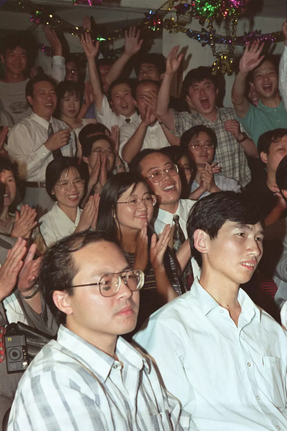 1997年6月30日,世界各地的華人華僑及中國留學(xué)生以各種方式慶祝香港回歸祖國。在日本日中友好會(huì)館后樂寮留學(xué)生宿舍舉行的聯(lián)歡晚會(huì)上,中國留學(xué)生在觀看香港政權(quán)交接儀式電視現(xiàn)場直播時(shí),激動(dòng)萬分。新華社記者 陳建力 攝
