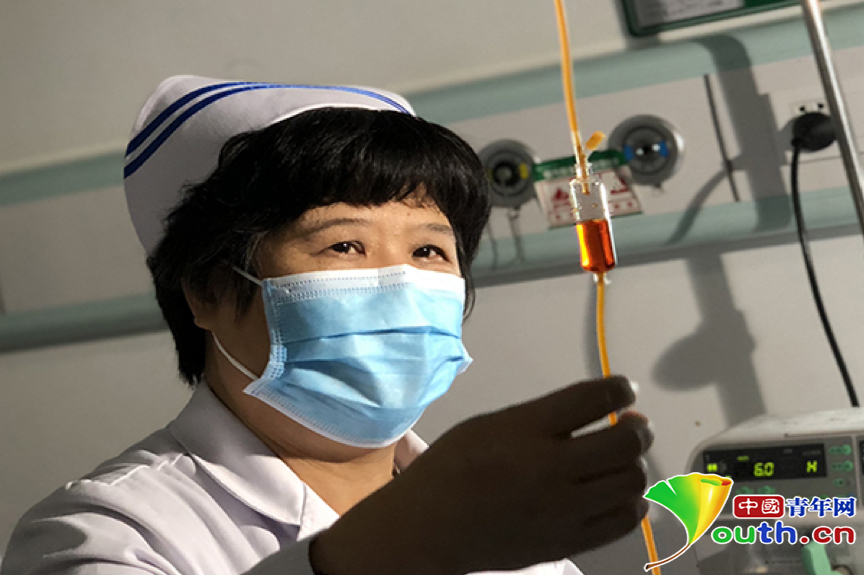 杜麗群在觀察艾滋病患者的點(diǎn)滴情況。廣西南寧市第四人民醫(yī)院供圖