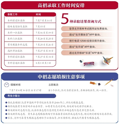 據(jù)北京教育考試院介紹,高招錄取工作于7月7日至8月3日進行。今年高校在京招生實行計算機遠程網(wǎng)上錄取,順序志愿第一志愿錄取結(jié)束后,若高校招生計劃未完成,將對未完成計劃進行第二志愿投檔錄取。