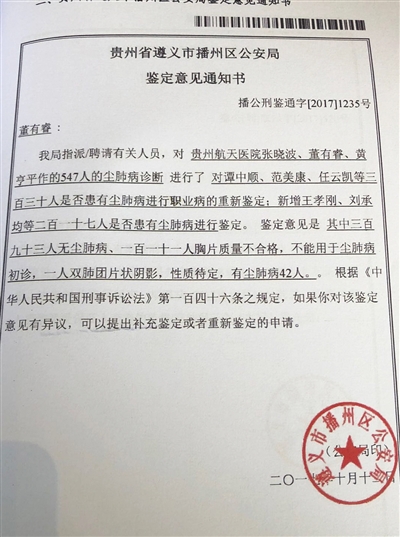 張曉波的妻子董捷告訴記者,辦案機(jī)關(guān)認(rèn)定三位醫(yī)生“失職罪”的主要依據(jù)是一份鑒定通知書。2017年10月12日,貴州省遵義市播州區(qū)公安局下達(dá)鑒定意見通知書,稱指派有關(guān)人員對張曉波、董有睿、黃亨平做的547人的塵肺病診斷進(jìn)行了重新鑒定。鑒定意見為其中393人無塵肺病、111人胸片質(zhì)量不合格,不能用于塵肺病初診;一人性質(zhì)待定;有塵肺病42人。