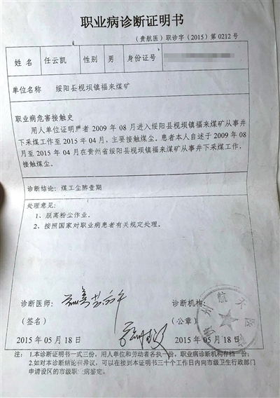 2015年5月18日,任云凱拿到了貴州航天醫(yī)院開具的職業(yè)病診斷證明書,診斷結(jié)論為煤工塵肺壹期。