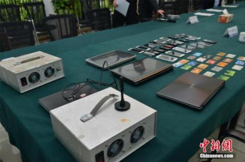 資料圖:浙江湖州吳興區(qū)警方現(xiàn)場(chǎng)展示繳獲的偽基站作案工具。中新社發(fā) 吳興公安 攝