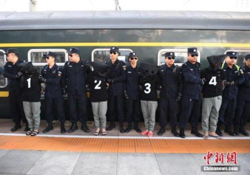 2017年8月29日,長(zhǎng)春火車站,10名電信詐騙犯罪嫌疑人被長(zhǎng)春警方從國(guó)外經(jīng)云南押解回國(guó)。中新社記者 張瑤 攝