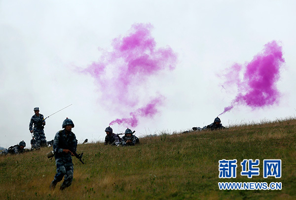 紅藍對抗中,殲“敵”信號發(fā)射后,“紅軍”主攻隊在模擬連連長指揮下,按照戰(zhàn)術(shù)編組發(fā)起進攻(資料照片)。新華社發(fā)(姚立 攝)