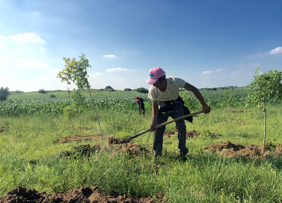 一路上,看到有幾十個村民在林地里忙碌著植樹。先是用鐵鍬在土地里刨坑,然后把帶有土壤的樟子松或五角楓樹放在刨好的坑里栽上。在長時間強烈的日照下,盡管他們戴著太陽帽,或穿戴嚴(yán)實、裹著頭巾,皮膚照樣曬得黝黑。村民告訴記者,因為不用去外地打工,可以在自己家的地盤上種樹,有收入,雖然苦點,還是很幸福的。