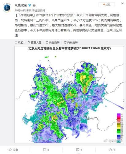 北京市氣象臺17日11時發(fā)布預(yù)報:今天下午陰有中到大雨,局地暴雨,北轉(zhuǎn)南風二三間四級,最高氣溫26℃,最小相對濕度80%;夜間陰有中雨,局地暴雨,最低氣溫23℃,最大相對濕度95%。已發(fā)布暴雨黃色、地質(zhì)災(zāi)害氣象風險橙色預(yù)警。