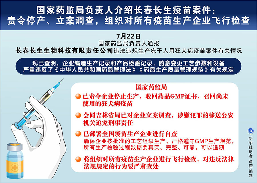 他說,現(xiàn)已查明,企業(yè)編造生產(chǎn)記錄和產(chǎn)品檢驗記錄,隨意變更工藝參數(shù)和設備。上述行為嚴重違反了《中華人民共和國藥品管理法》《藥品生產(chǎn)質量管理規(guī)范》有關規(guī)定,國家藥監(jiān)局已責令企業(yè)停止生產(chǎn),收回藥品GMP證書,召回尚未使用的狂犬病疫苗。國家藥監(jiān)局會同吉林省局已對企業(yè)立案調查,涉嫌犯罪的移送公安機關追究刑事責任。