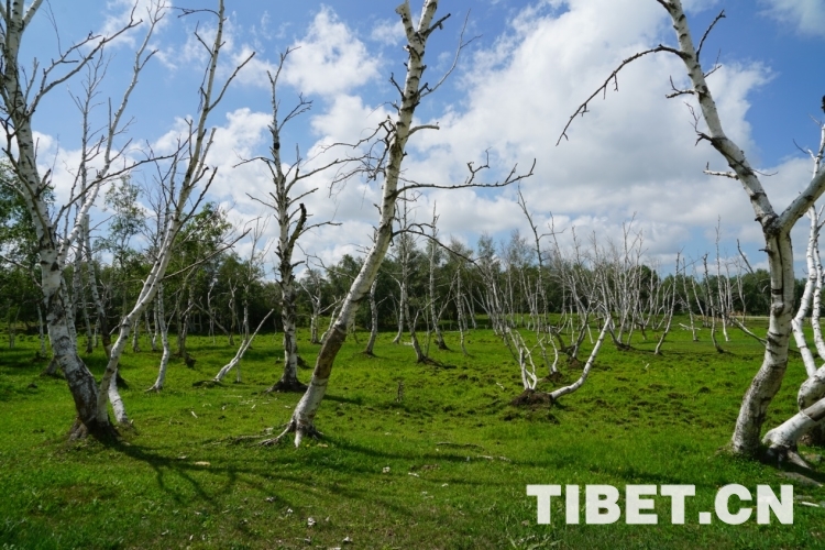 草原上的白樺林難得一覓。在距西烏珠穆沁旗高勒鎮(zhèn)五十公里處的公路兩旁,獨(dú)有一片白樺佇立在蒼茫天地間,白色枝干直刺蒼穹,好似一群勇士,守護(hù)著這片遼闊的土地。