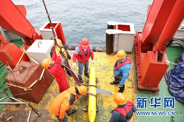北京時間28日5時23分,考察隊隊員們將“海翼”號水下滑翔機(jī)緩緩送入海中。在成功入海后,“海翼”號開始對所在海域執(zhí)行剖面觀測。