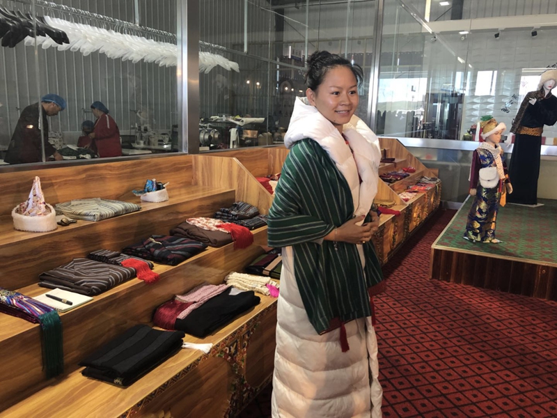 28歲的東格央宗拉姆對自己店內(nèi)的服裝如數(shù)家珍。她的服裝公司今年6月剛剛起步,當?shù)卣悦吭旅科椒矫?0元的低租金為她這樣的創(chuàng)業(yè)者提供廠房。
