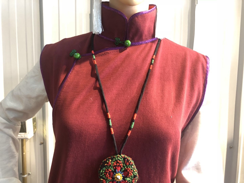 “這件衣服,我設計時結(jié)合了旗袍和藏族服飾的特征,盤扣采用了旗袍的設計,但是領(lǐng)邊是藏服特有的設計?!?/p>