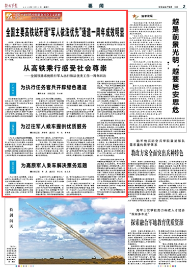 去年8月1日,中國鐵路總公司、軍委后勤保障部聯(lián)合決定,在全國鐵路系統(tǒng)開展軍人出行依法優(yōu)先工作。這項政策實(shí)施一年來成效如何?記者走進(jìn)高鐵站進(jìn)行了采訪調(diào)查,實(shí)地探訪“軍人依法優(yōu)先”給官兵出行帶來的新變化。請關(guān)注今天出版的《解放軍報》的報道——