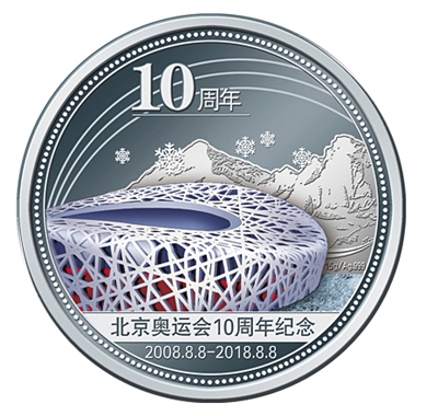 直徑35毫米,由999足銀制作,重15克。采用獨(dú)特造幣彩印工藝精細(xì)呈現(xiàn)了兩屆奧運(yùn)會開幕式場館鳥巢的倩影。