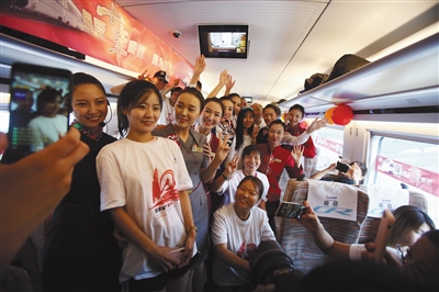 8月1日,乘客與乘務(wù)員在京津城際復(fù)興號(hào)列車內(nèi)合影。新京報(bào)記者 王貴彬 攝