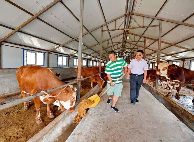 吉林省磐石市煙筒山鎮(zhèn)大黑山村駐村第一書記闞閱(右)在了解大黑山村肉牛飼養(yǎng)情況 張楠攝/ 本刊