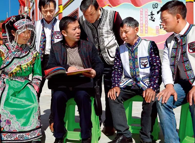 貴州省六盤水市鐘山區(qū)大灣鎮(zhèn)海嘎村駐村第一書記楊波(前左二)向海嘎村彝族村民宣講十九大精神 劉續(xù)攝/ 本刊